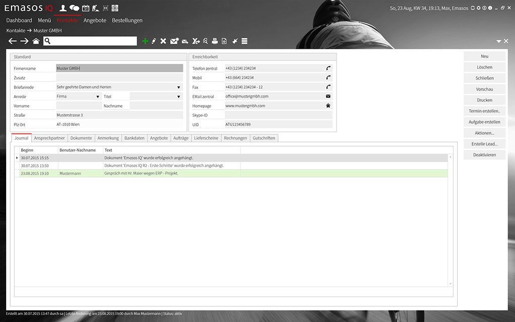 Der Transformationsprozess in die postmoderne ERP-Welt hat schon längst begonnen. Die Frage ist also nicht, ob Sie ihn mitvollziehen, sondern vielmehr, wie schnell Sie es tun. Entscheiden Sie sich für den schnellen Weg. Mit Emasos IQ sind Sie nicht nur rascher am Ziel, sondern auch weiter vorn. Denn Emasos IQ ist die erste Business Software Plattform, die alle Unternehmensprozesse, ohne Brüche und Schnittstellen, abdeckt. Emasos IQ erhebt Echtzeit zum allein gültigen Zeitmaß in der Unternehmenssteuerung und treibt die Automatisierung auf die Spitze. Zudem ist es das erste System seiner Art, welches auf allen gängigen Betriebssystemen und Devices arbeitet. Ihnen wird so die Freiheit geboten ort- und zeitunabhängig zu arbeiten und die Produktivität effizient zu steigern.