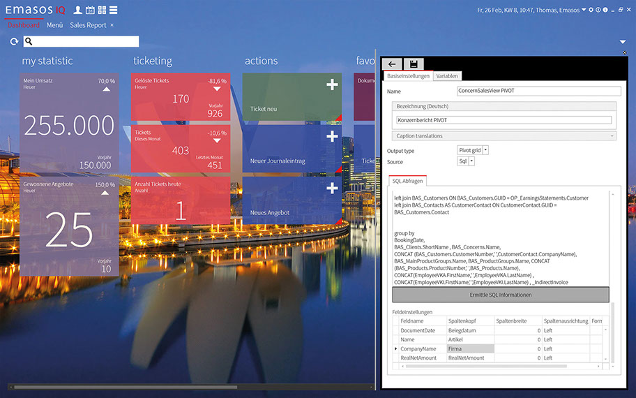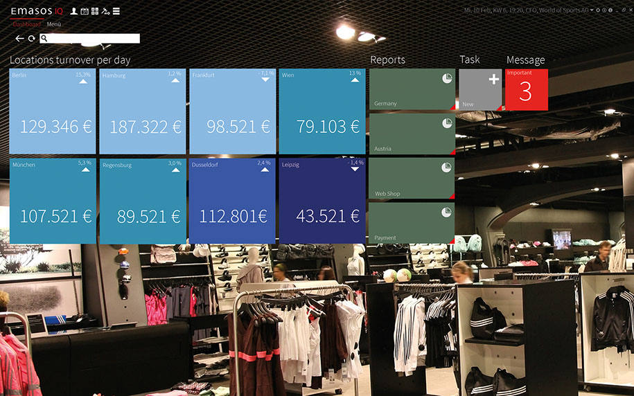 Optimal bedeutet zum Beispiel immer in Echtzeit, so wird immer nur mit den aktuellsten Daten operiert . Auf der konzeptionellen Basis als native „Client-Familie“ bietet Ihnen Emasos IQ auch volle Flexibilität bei der Anpassung an individuelle Bedürfnisse. Ändern Sie ein Design, ein Dashboard oder eine Einstellung auf dem Hauptclient, ändern Sie es überall. Darüber hinaus lässt sich Emasos IQ mit zusätzlichen Scripts in vielen Bereichen noch weiter auf die Spitze der Effizienz treiben.