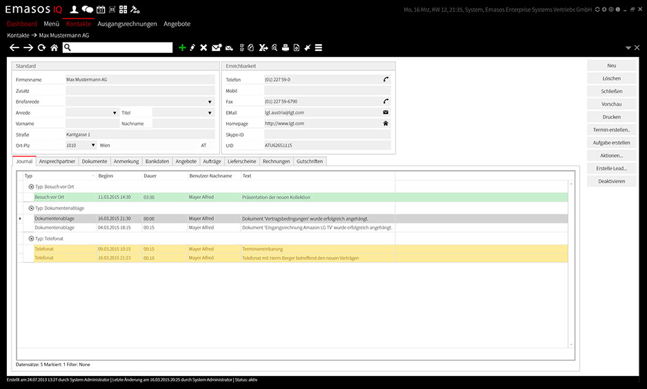 Die integrierte Informationszentrale in Emasos IQ hält Sie und Ihre Mitarbeiter immer am aktuellen Stand der Dinge. Per E-Mail und SMS sendet sie in Echtzeit ausgewählte Informationen über so gut wie alles, was sich in Ihrem Unternehmen gerade tut.